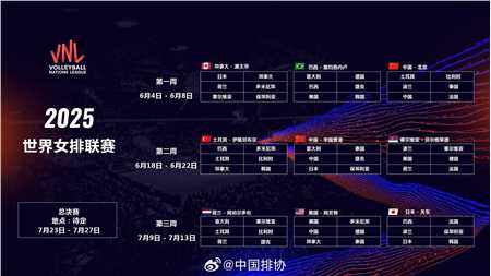 据@中国排协 消息,2025年世界女排联赛分站赛将于2025年6月4日至7月13日举行,总决赛将于7月23日至7月27日举行。参赛的18支队伍为:意大利、日本、波兰、巴西、中国、土耳其、美国、泰国、荷兰、加拿大、多米尼加、塞尔维亚、德国、法国、韩国、保加利亚、捷克、比利时。