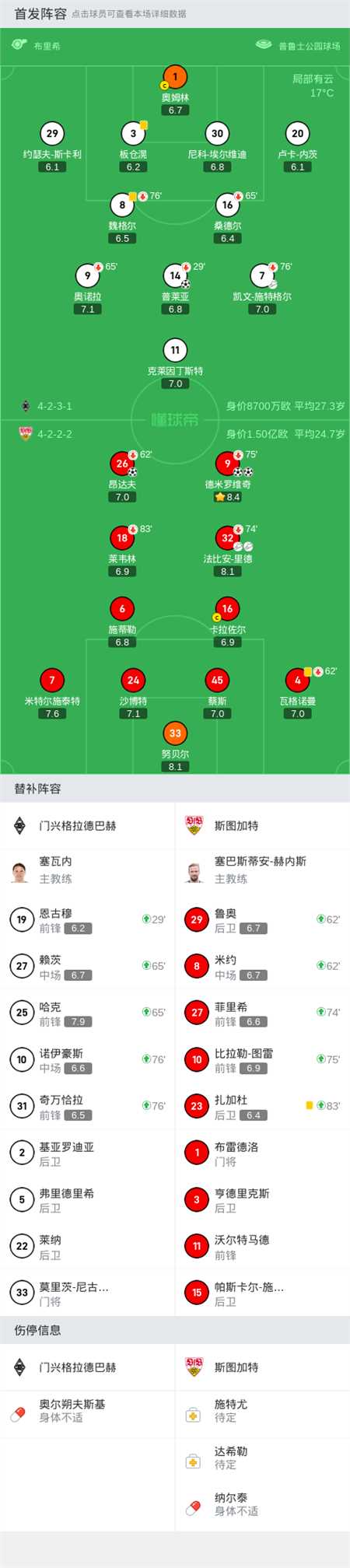 在德国足球顶级联赛第3轮的比赛中,门兴格拉德巴赫主场迎战斯图加特。比赛中,斯图加特的昂达夫率先打入一球,随后门兴格拉德巴赫的普莱亚在凯文-施特格尔的助攻下扳平比分。下半场,斯图加特的法比安-里德两次助攻德米罗维奇,后者梅开二度,帮助球队锁定胜局。最终,斯图加特以3比1战胜门兴格拉德巴赫。