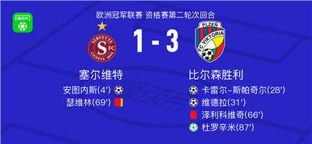北京时间7月31日,欧洲冠军联赛资格赛第二轮次回合,塞尔维特迎战比尔森胜利。比赛开始后,鲁耶送出助攻,安图内斯为塞尔维特先拔头筹。随后,德韦送出助攻,卡雷尔-斯帕奇尔为比尔森胜利扳平比分。不久之后,维德拉破门,帮助比尔森胜利反超比分。下半场,泽利科维奇因犯规吃到第二张黄牌被红牌罚下,随后瑟维林也因累积两张黄牌离场。比赛尾声阶段,杜罗辛米主罚点球命中,为比尔森胜利扩大比分。最终,全场比赛结束,塞尔维特1-3不敌比尔森胜利。两回合总比分塞尔维特2-3比尔森胜利。