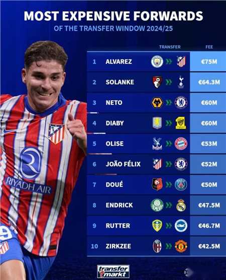 德国转会市场网站统计出了2024-25赛季夏窗转会身价最高的10名锋线球员,以7500万欧元的价格从曼城转投马德里竞技的胡利安-阿尔瓦雷斯高居第一,索兰克、佩德罗-内托、迈克尔-奥利塞、若昂-菲利克斯、德西雷-杜埃、恩德里克以及齐尔克泽也都榜上有名。