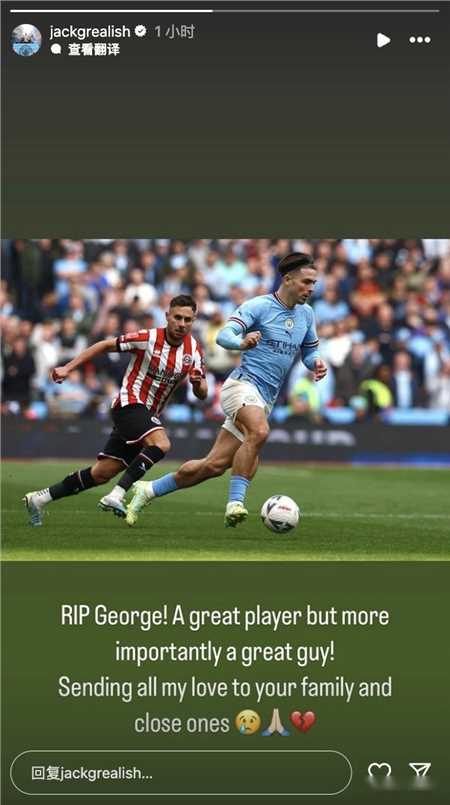 在前谢菲联后卫鲍多克在希腊家中泳池去世后,格拉利什在社交媒体更新了动态,悼念鲍多克。